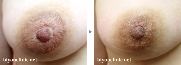 乳輪が大きい方は、元々バストが大きい方が多く、乳輪縮小後バストの重みで、外側に乳輪が引き伸ばされるために、再度乳輪が大きくなることがあります。更にその際に傷が開いて傷が目立つようになることがあります。乳輪の再拡大、傷開大を予防するためには追加処置が必要になります。