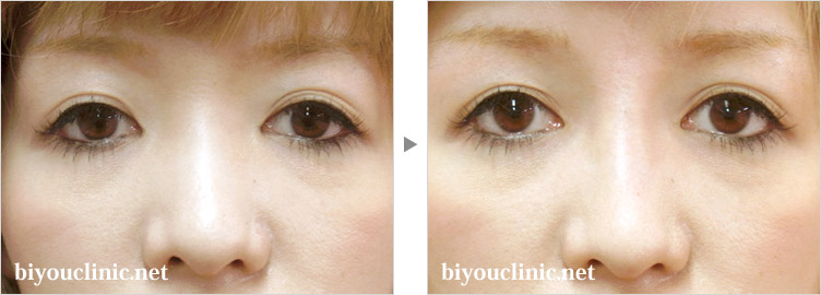 某美容外科で目の下クマ取り治療のためにヒアルロン酸注入を行った症例です。ヒアルロン酸を注入した場所が却ってプクッと膨れて目立つようになったために修正を希望されました。ヒアルロニダーゼを使用して、入れたヒアルロン酸の一部を融かして、膨れた部分を取り、下まぶたを平らで滑らかにしました。目の下のクマ取りを目的として、目の下日ある蘭さん注射が行われています。しかし下まぶたは皮膚が薄いためにヒアルロン酸を入れた時に、その部位が膨れることがあります。その場合は、ヒアルロニダーゼを注射してヒアルロン酸を融かしたり、ヒアルロン酸を段差になっている部位に追加注射したりし、下まぶたを平坦にする治療を行います。