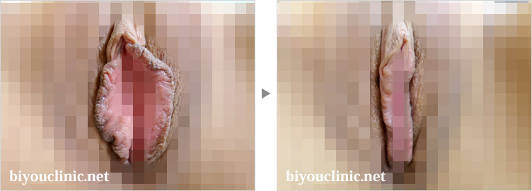 数年前に某美容外科で小陰唇縮小手術を行った症例です。小陰唇縮小手術後も小陰唇の色が黒くはみ出しており、傷もギザギザで汚いために再手術を希望して御相談いただきました。色素沈着して黒々とした部位をできる限り切除して、小さく綺麗な小陰唇を作りました。小陰唇縮小手術は、小陰唇が肥大した部位を切除し、その断端を縫合するという単純な手術です。しかし執刀医により、経験した症例数が異なるために出来上がりに差がみられることがあります。小陰唇縮小手術後、色が黒々している、大きくはみ出している、左右の大きさが異なる、断端がギザギザしているなどの場合は修正手術が必要になる場合があります。